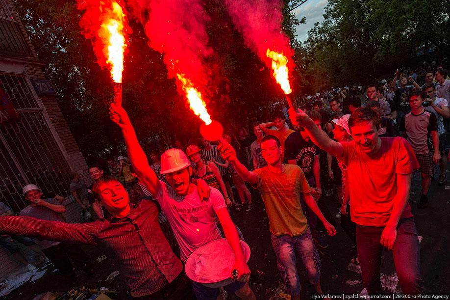 Приехавшая полиция пыталась усмирить толпу, но безрезультатно. Они просто стояли в стороне и смотрели, как студенды зажигают фаеры. Ко мне подошел какой-то парень: "Ты не знаешь, почему нас не разгоняют? Я скандировал "Россия без Путина!", а полицейские ничего не делают. Почему?!"