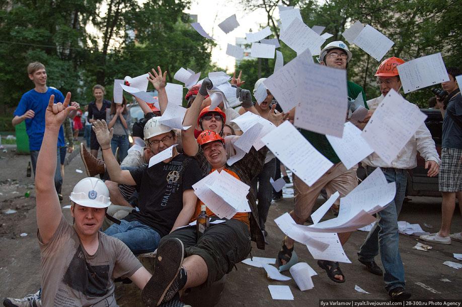 «Когда всё сдал, тебе просто необходимо совершенно бешеннейшее ощущение свободы! Ты идешь и бросаешь тубус в Яузу (обычно они там плавают каждый будний день с 15-25 июня каждого года). Ты приезжаешь к родным стенам общаги, где тебя ждут друзья-братья уже с заготовленными спичами, тазами и холодильниками. Тебя кое-как скатили с общаги и ты уже, еле стоя, подползаешь к тазу и машине. И вот тут алкоголь как рукой снимает. Страшно жутко и невероятно. Когда на спидометре 60, в тазу тебе все 200!! Невероятно! Потрясно!!! И тебя все обливают пивом, ты сменяешь пару-тройку комплектов одежды за вечер, потому что поток пива-шампанского безграничен и все льется в виде фонтана на новоиспеченного инженера! Ребят, это потрясно! Это память на всю жизнь!»
