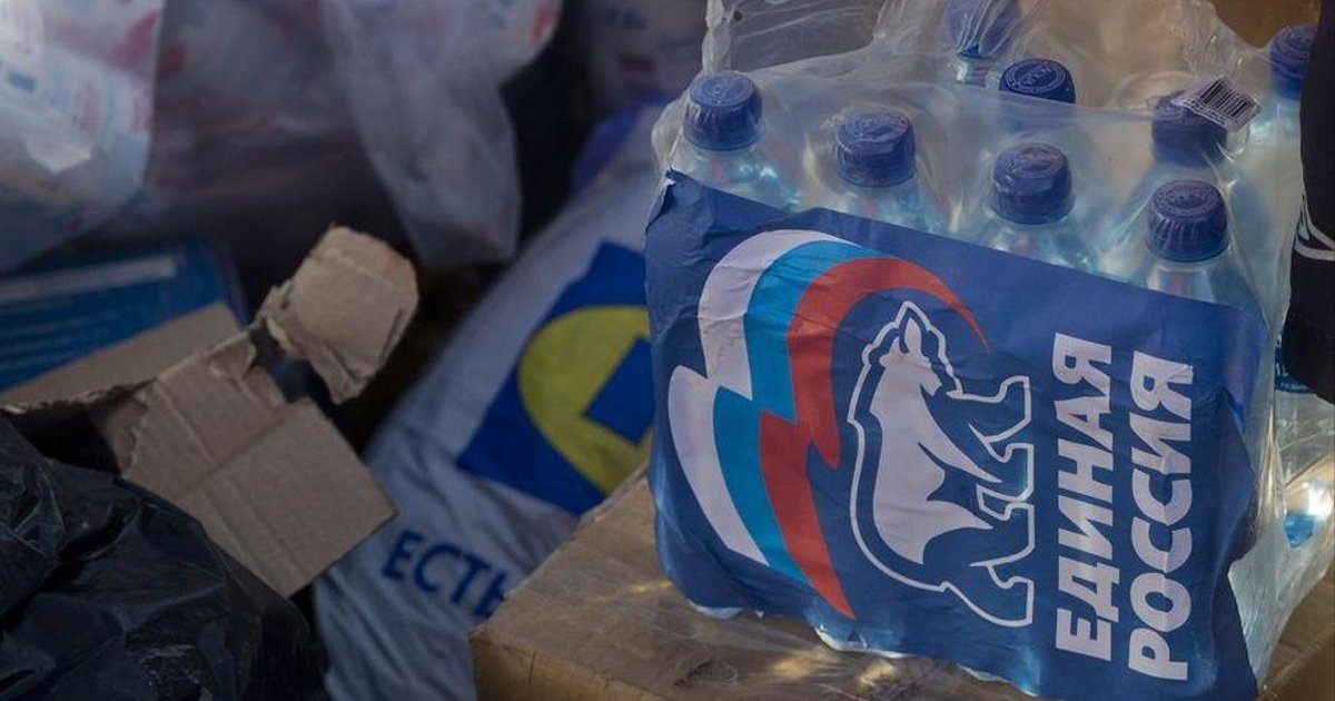 Без наклеек «Единой России» грузы с гуманитарной помощью, в том числе канистры с питьевой водой, не пропускают к месту трагедии. Партия власти клеит свои стикеры, хотя не имеет к грузам никакого отношения.