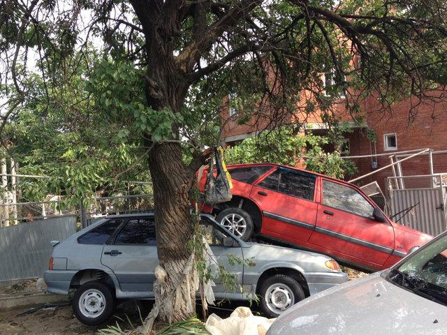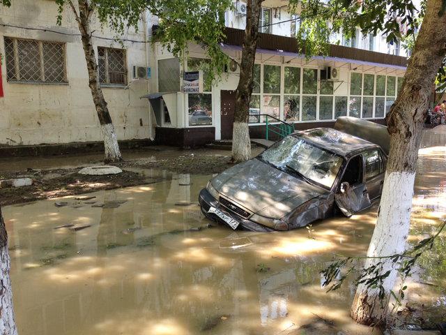 Потом Артем, которому какие-то знакомые говорили, в каких местах еще есть затопления и проблемы, повез нас и еще одну легковую с тремя парнями, которые приехали в Новороссийск отдыхать из Питера и еще откуда-то, по первому адресу. По дороге мы увидели несколько откачивающих воду машин - шланги с потоком воды были выставлены на мост, и вода стекала в грязное русло реки: