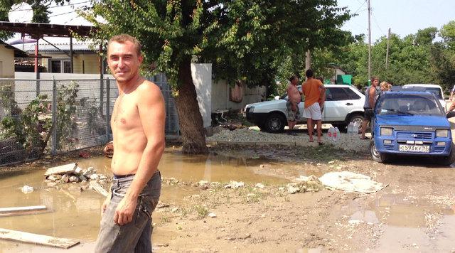В ту ночь он был в Новороссийске, а дома осталась его беременная на 2 месяце жена и две дочки, старшей из которых лет 12. Первый раз жена позвонила ему, когда вода была почти под потолком, чтобы попрощаться с ним. Как он сказал, всего для этой цели она звонила три раза - представляете - три раза за ночь человек прощался со всей своей семьей. Он сразу выехал домой, но пробраться в город было невозможно, полиция на въезде сказала ему "ну попробуй как-нибудь аккуратненько". Он разговаривал со мной, улыбаясь, потому что его семье удалось спастись - жена каким-то чудом смогла открыть люк на чердак и втащить туда детей - старшая девочка чуть не утонула. Он потерял все имущество и весь дом, осталась только машина. Он очень хотел, чтобы люди знали о том, что происходит, потому что власти многое замалчивали. На центральной площади одного парня, по его словам, скрутили и чуть не зарезали казаки за то, что тот снимал происходящее на камеру.