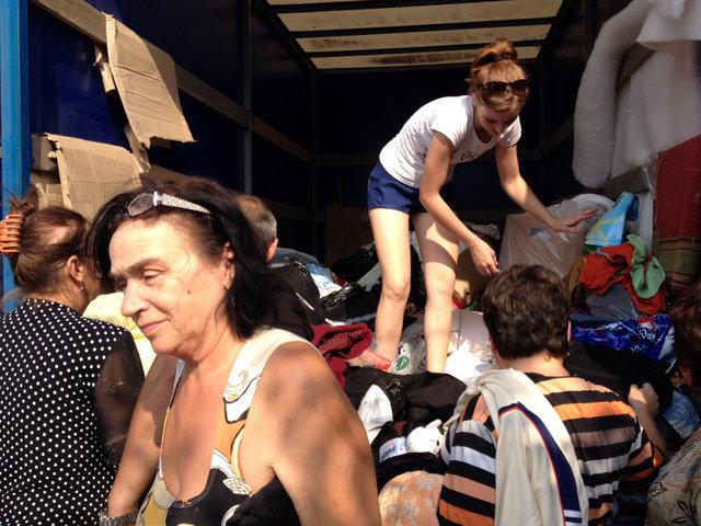 Следующим пунктом назначения была улица Короткая, по дороге на которую мы наткнулись на похороны, а на самой Короткой два ребенка качались на уцелевших качелях, и несколько взрослых вышли принять у нас вещи и воду. Был тихий мужчина, у которого приходилось выспрашивать, сколько детей и какого возраста, потому что было очевидно, как ему трудно просить о чем-то двух юных девушек в виде меня и Тани, были женщины, которые очень просили легкую одежду - а ее было мало, многое уже раздали. И опять мы были первыми, кто к ним приехал.