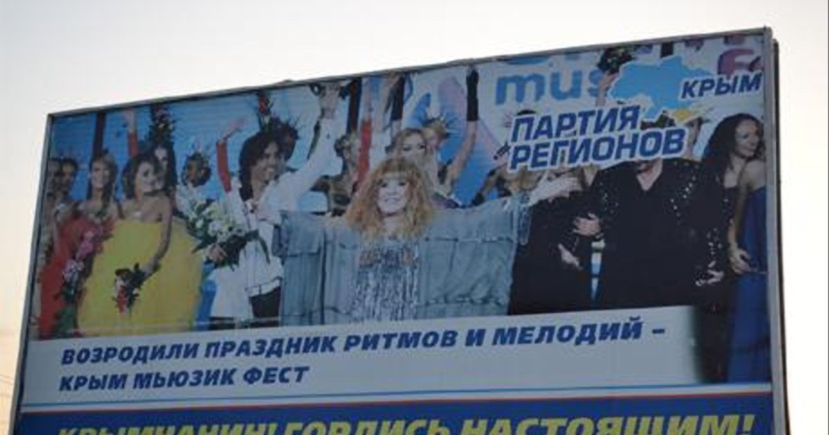 Согласно билборду, Партия регионов ставит себе в заслугу проведение Фестиваля Пугачевой Crimea Music Fest - "возродили праздник ритмов и мелодий".