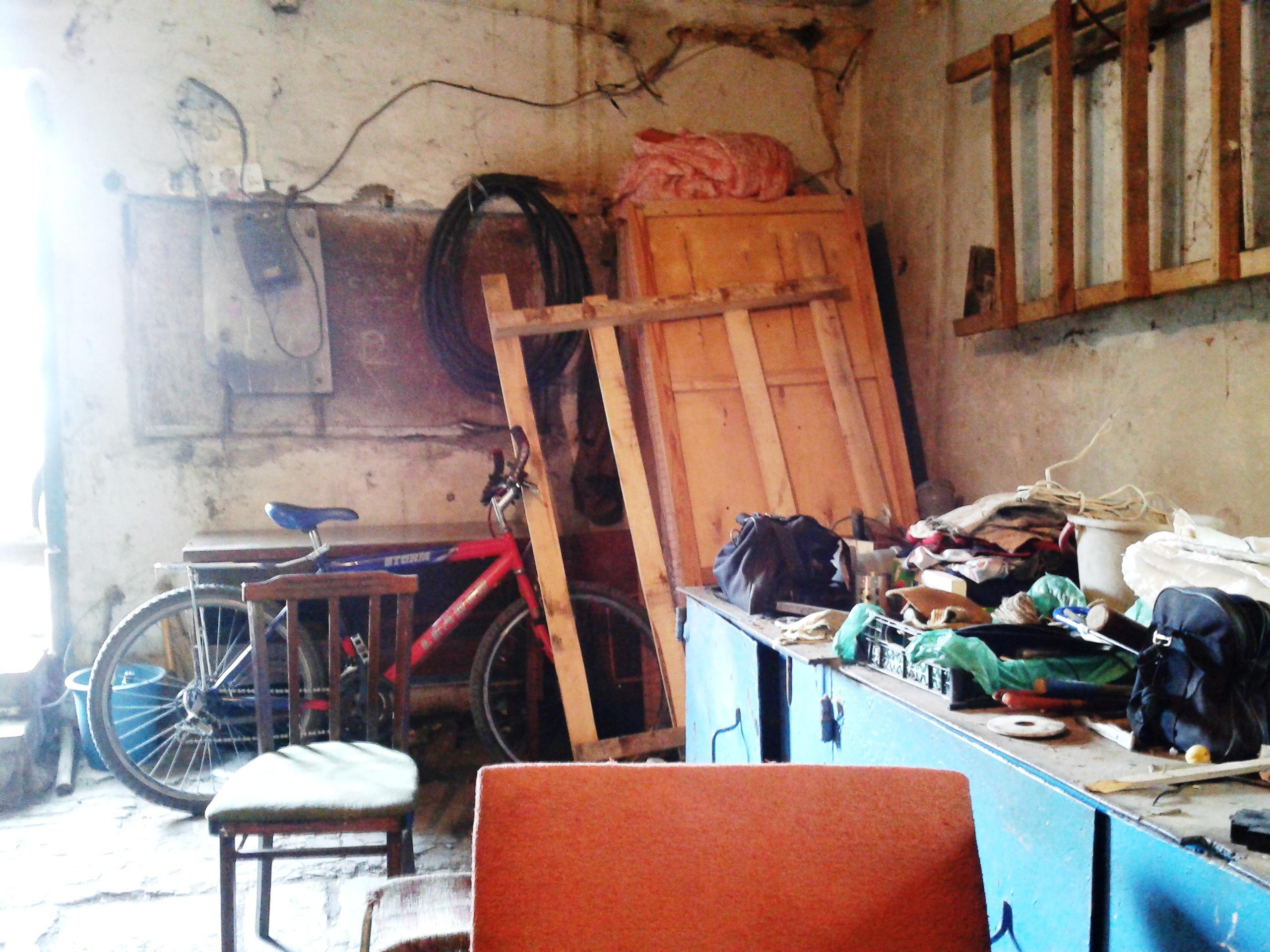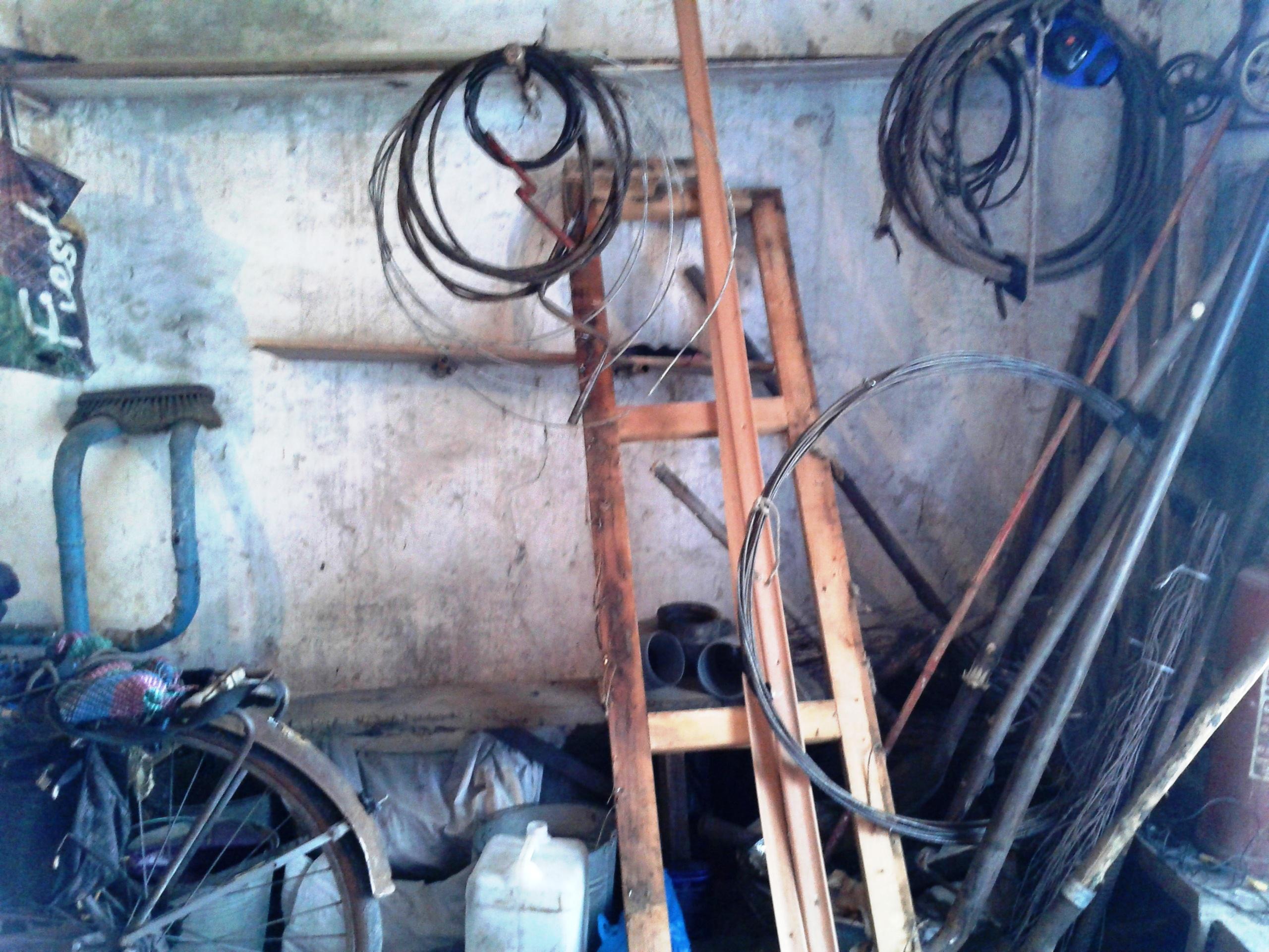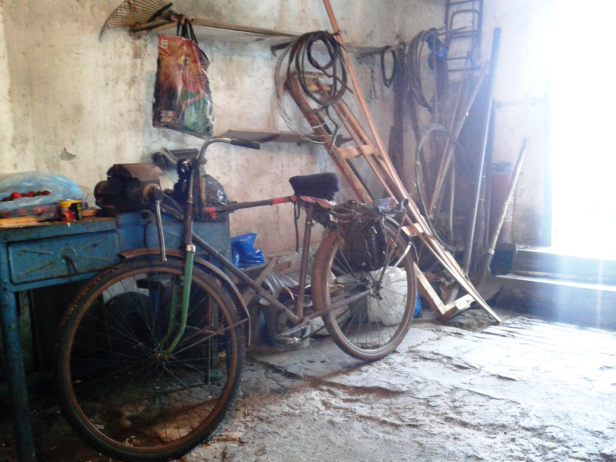 Рабочий уголок украшают: лестница, пакет, грабли, старый ржавый велосипед, несколько лопат, веник и пара тросов.