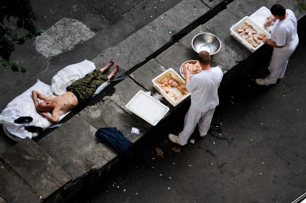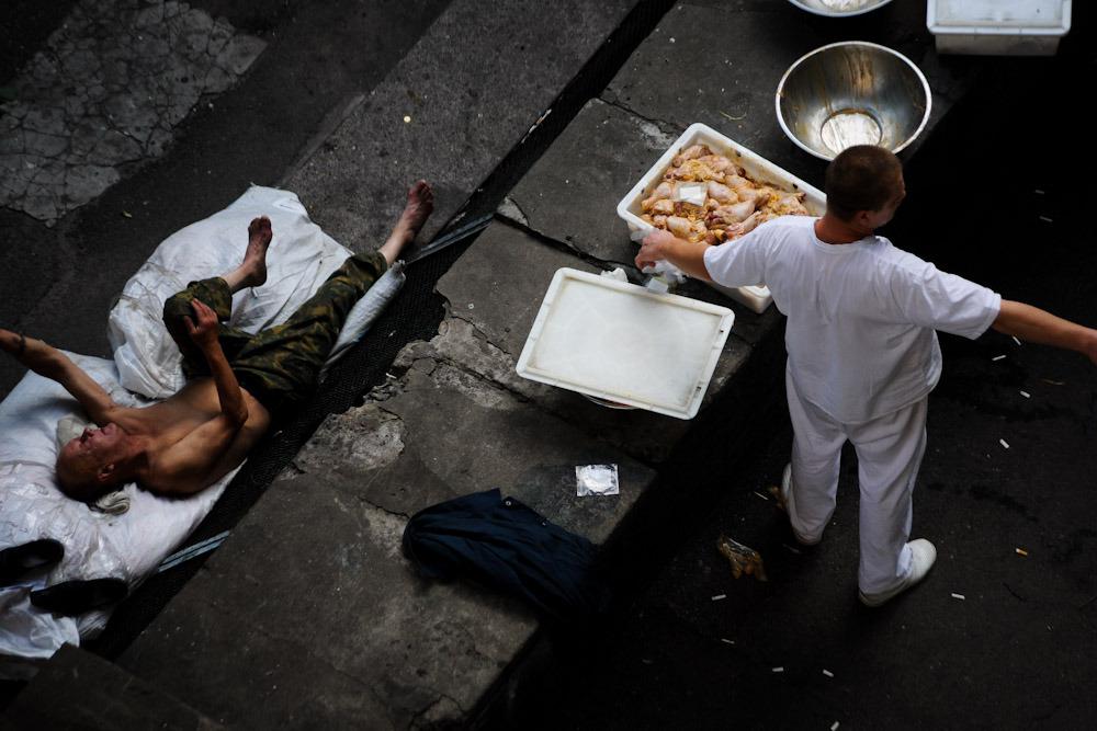 Во дворике между помещением метро Крещатик и Пассажем, именно там, где находится платный туалет, работники ресторанной кухни сортируют мясо.