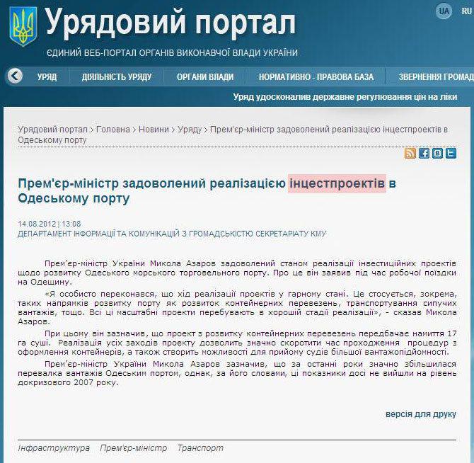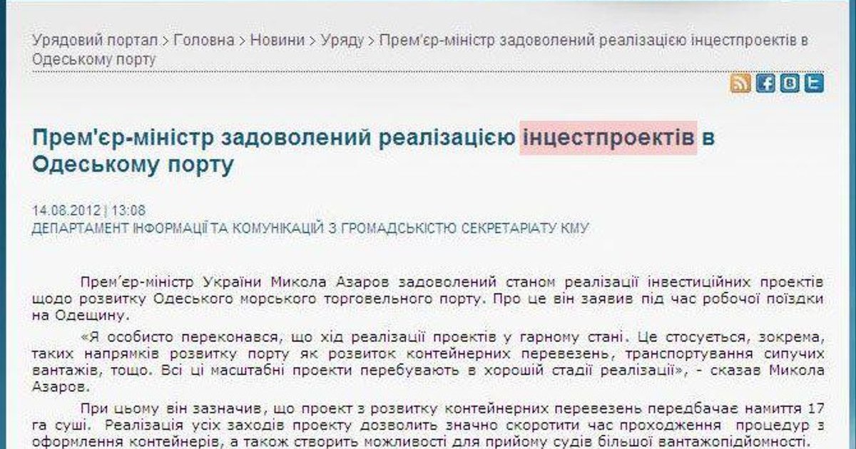 "Премьер-министр доволен реализацией инцестпроектов в Одесском порту", - гласил заголовок на сайте Кабмина, который вызвал ироничные комментарии блогеров, и позже был исправлен, передает Цензор.НЕТ.