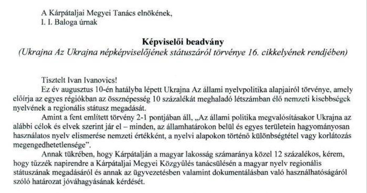 "Обращение на венгерском к председателю Закарпатского облсовета Ивану Балоге - брату министра правительства Януковича-Азарова Вити Балоги - по выполнению языкового закона", - написал депутат под документом, распространенном в Facebook.