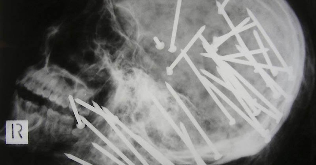 Гвоздь в человеческом черепе - пациент случайно выстрелил в себя из пневматического молотка. Он даже не понял, что выстрелил в себя - 10-метровый гвоздь обнаружили только через 6 дней.
