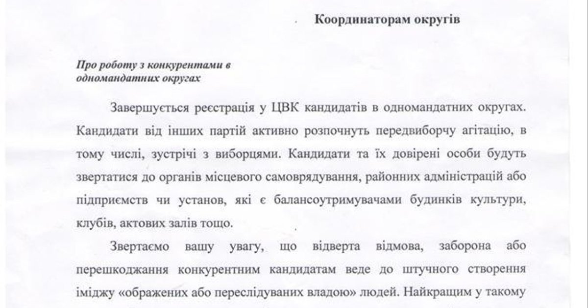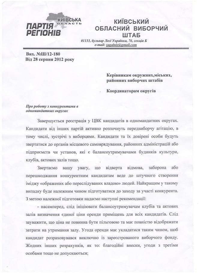 В распоряжение редакции попало письмо от 28 августа 2012 года отправленное всем руководителям окружных, городских и районных штабов Партии регионов в Киевской области.