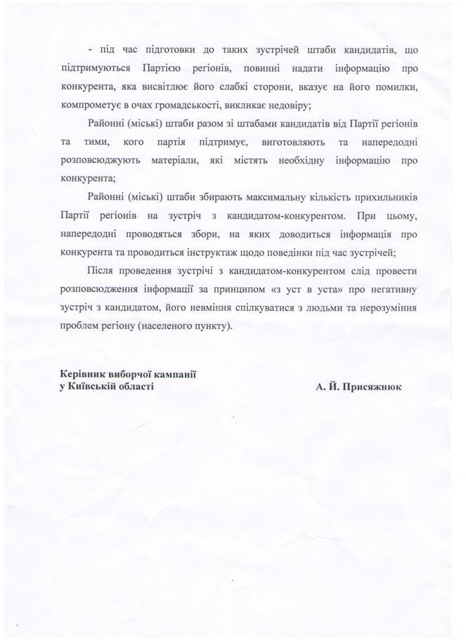 Местным ячейкам Партии регионов и штабам дружественных власти кандидатов также поручено изготовлять материалы с компрометирующей информацией и распространять ее накануне встреч кандидатов от оппозиции.