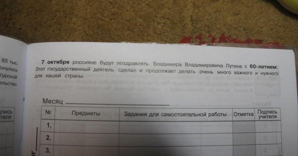 "7 октября россияне будут поздравлять Владимира Владимировича Путина с 60-летием. Этот государственный деятель сделал и продолжает делать очень много важного и нужного для нашей страны", - цитата из дневника.