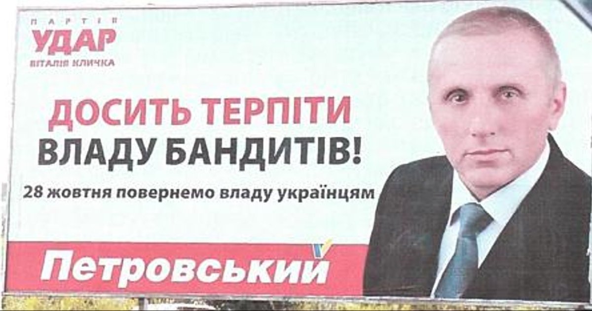 "При этом никаких упоминаний о Партии регионов в рекламе не было. Впрочем, представители ПР решили, что агитация Петровского направлена именно против их политической силы, поэтому назвали упомянутые борды "клеветнической информацией оскорбительного характера", - заявили в партии Виталия Кличко.