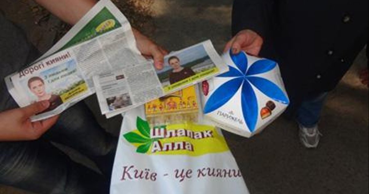 В подарочный набор входили коробка конфет и пакет чая, а также литература агитационного характера, в том числе биография Шлапак.