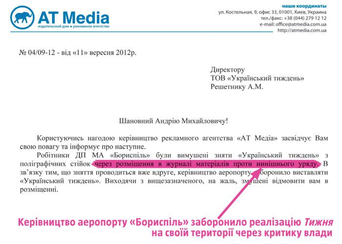 Согласно документу, именно после этой публикации руководство международного аэропорта "Борисполь" запретило распространять "Українский тиждень" и англоязычную версию The Ukrainian Week.