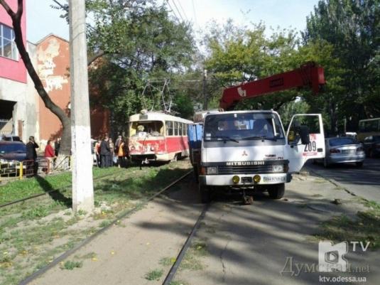 Сегодня утром в Одессе автокран столкнулся с трамваем. Проишествие произошло на улице Черноморского казачества.