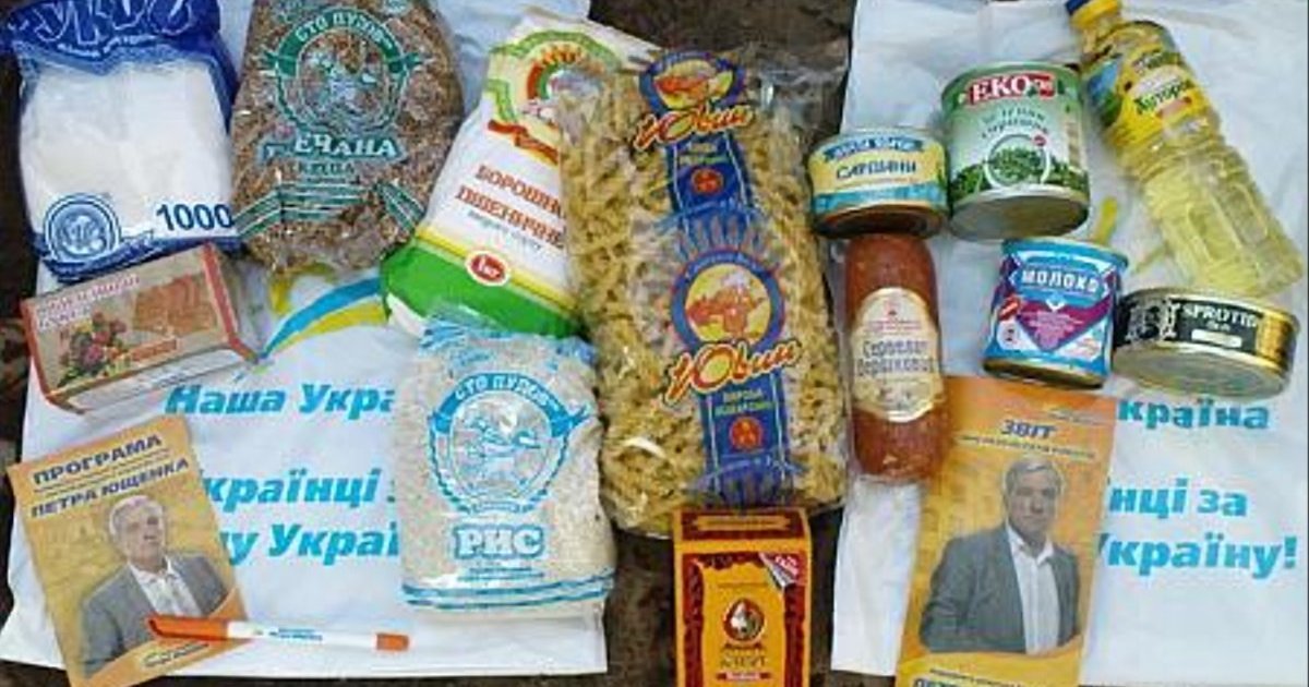 В пакетах с логотипом партии "Наша Украина" раздавали палку колбасы, консервную банку шпрот, консервную банку сардин, бутылку масла, пачку печенья, пачку макарон, пачку муки, пачку риса, пачку гречки, 1 кг. сахара, пачку чая, пачку кофе, сгущенное молоко, банка зеленого горошка.