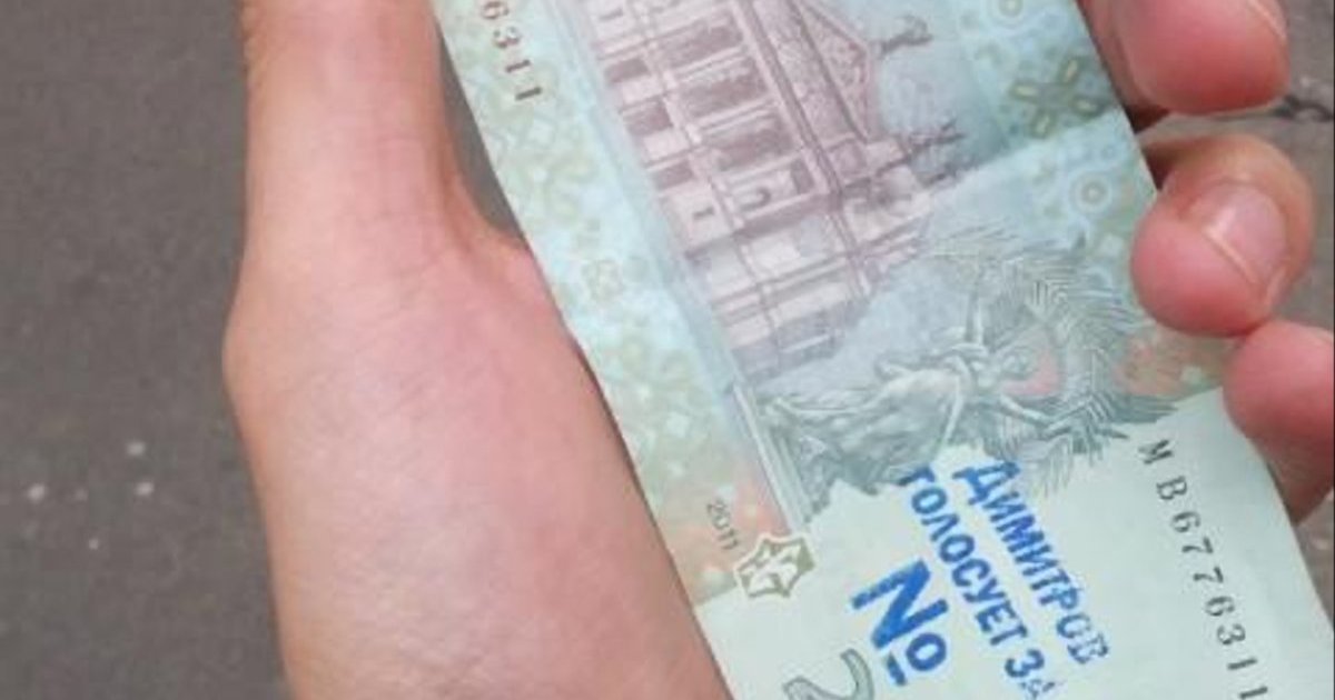 В городе Димитров в Донецкой области ходят купюры номиналом 20 гривен, на которых напечатано "Димитров голосует за № 20".