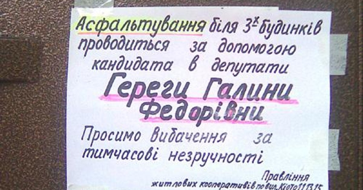 Так на домах по улице Киото появились объявления о том, что асфальт во дворе ремонтируют благодаря Гереге, передает Цензор.НЕТ со ссылкой на "Украинскую правду. Киев".