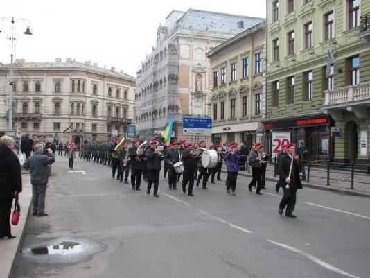 "Мы идем в такой форме, которую носили украинские военные в ноябре 1918 года, когда власть, которая к тому времени находилась в руках Австро-Венгерской империи, была передана жителям Галичины, - рассказал Любомир Горбач, 38 лет, председатель общественной организации Общество поиска жертв войны "Память", - 1 ноября жители Львова, проснувшись, отправились к местам труда и увидели необычную картину: у всех стратегически-важных сооружений стояли воины, которые были одеты, как воины Австро-Венгерского войска, но на них были сине-желтые ленты, символизирующие украинскую нацию. На городской башне впервые развевался украинский флаг. А потом началась настоящая война в городе. Погибло много украинцев и поляков. В честь погибших мы проводим акцию".