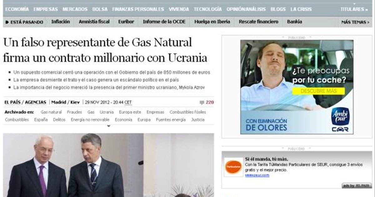 Влиятельные издания иллюстрируют свои материалы фотографией украинского премьера Азарова и министра энергетики Бойко, которые с улыбкой наблюдают за тем, как руководитель Госагентства по инвестициям и управлению нацпроектами Украины Владислав Каськив подписывает договор с человеком, который не имеет на это права. Испанские журналисты удивляются, как руководители огрмной страны могли договариваться с «самозванцем» и «подставным» человеком, передает Цензор.НЕТ со ссылкой на glavcom.ua.