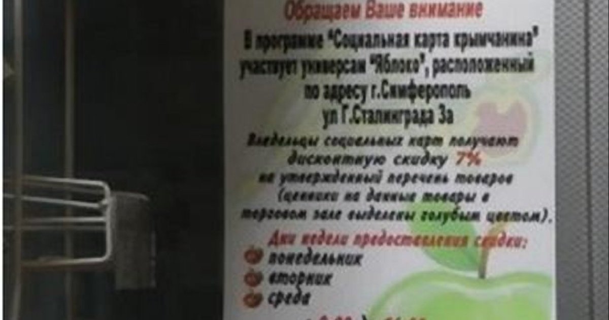 "Уважаемые покупатели! Обращаем ваше внимание: в программе "Социальная карта крымчанина" участвует универсам "Яблоко", расположенный по ул. Героев Сталинграда, 3-а", - указано в объявлении.