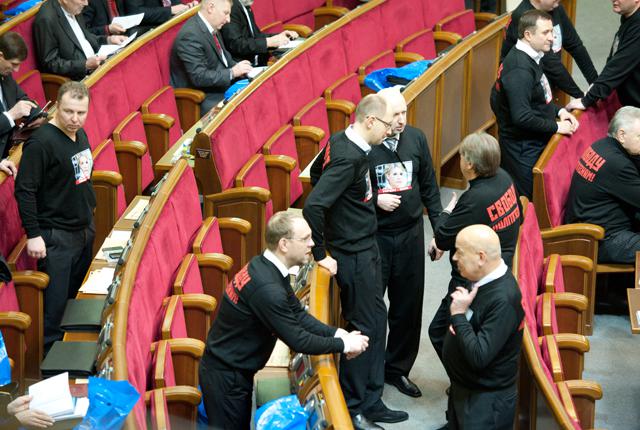 Представители Объединенной оппозиции "Батькивщины" в первый день работы парламента пришли в черных свитерах с изображением Юлии Тимошенко на груди и надписью "Свободу политзаключенным" на спине.