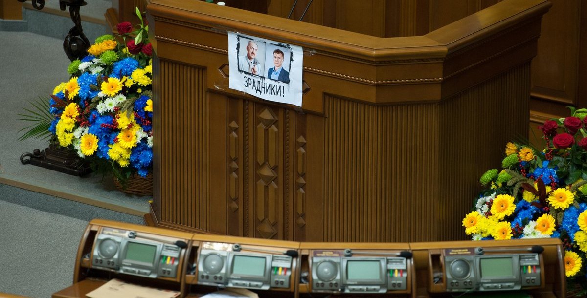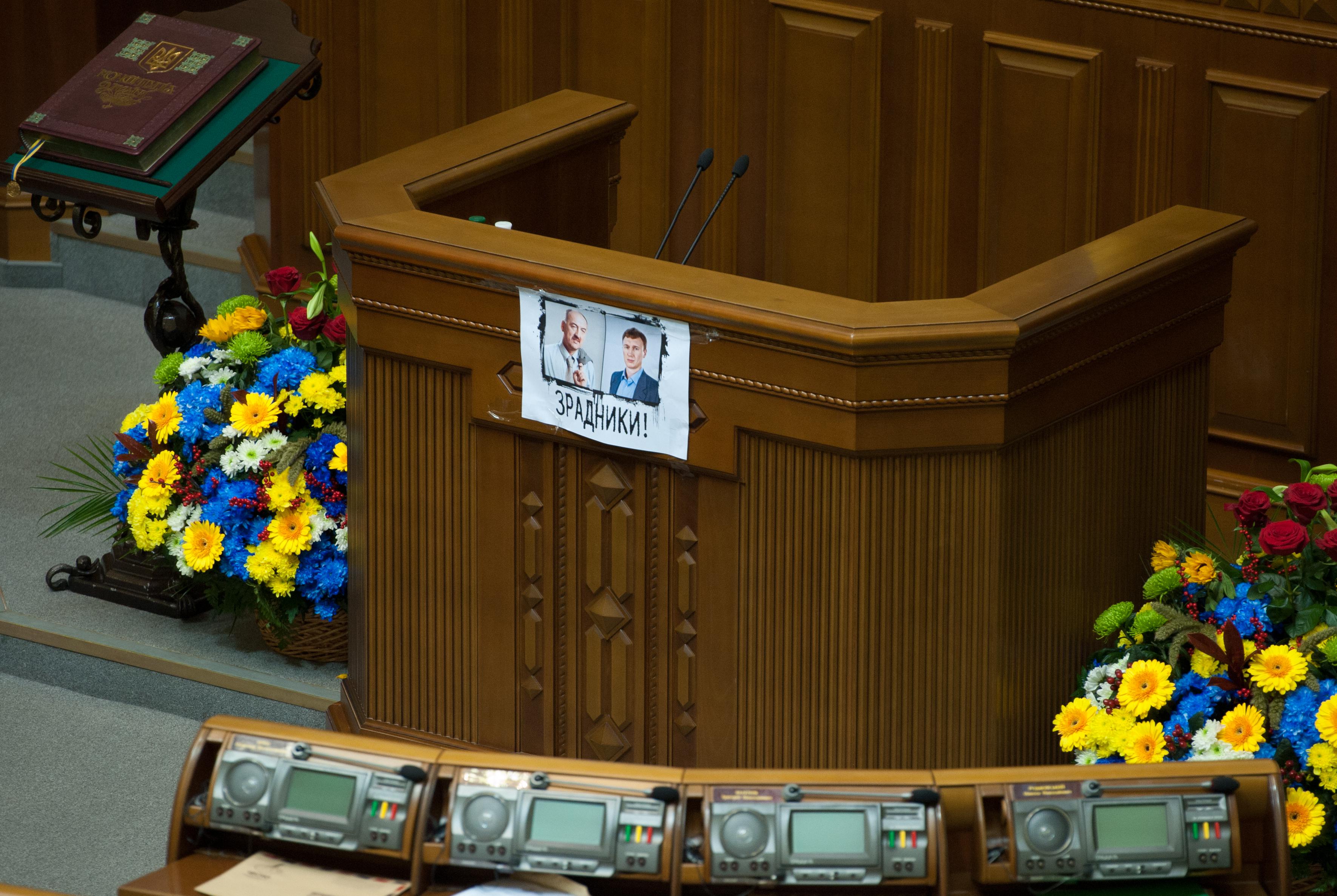 Фотографии "тушек" - Александра и Андрея Табаловых - были повешены на трибуне ВР с подписью: "Зрадники!".