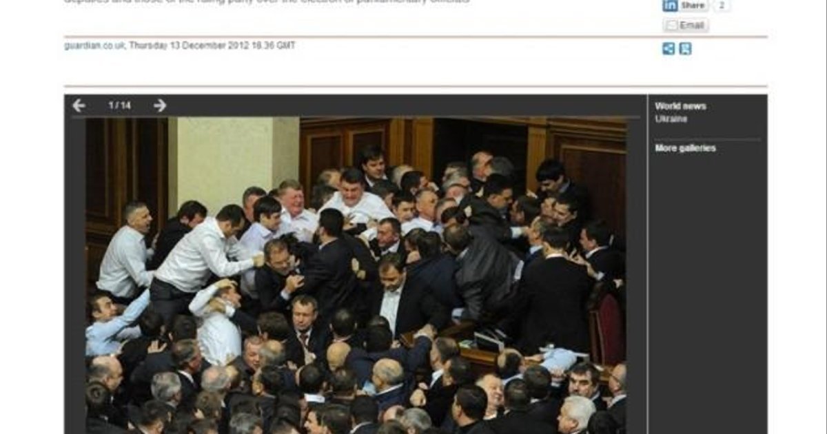 Авторитетная британская The Guardian опубликовала материал под названием «Драки в украинском парламенте в картинках». В материале подано следующее описание происходящего: «члены парламента подрались из-за правил голосования второй раз за два дня во время сессии новоизбранного парламента в Киеве. Сессия была прервана на фоне того хаоса, который происходил во время драки оппозиции и представителями провластной партии во время выборов членов президиума».