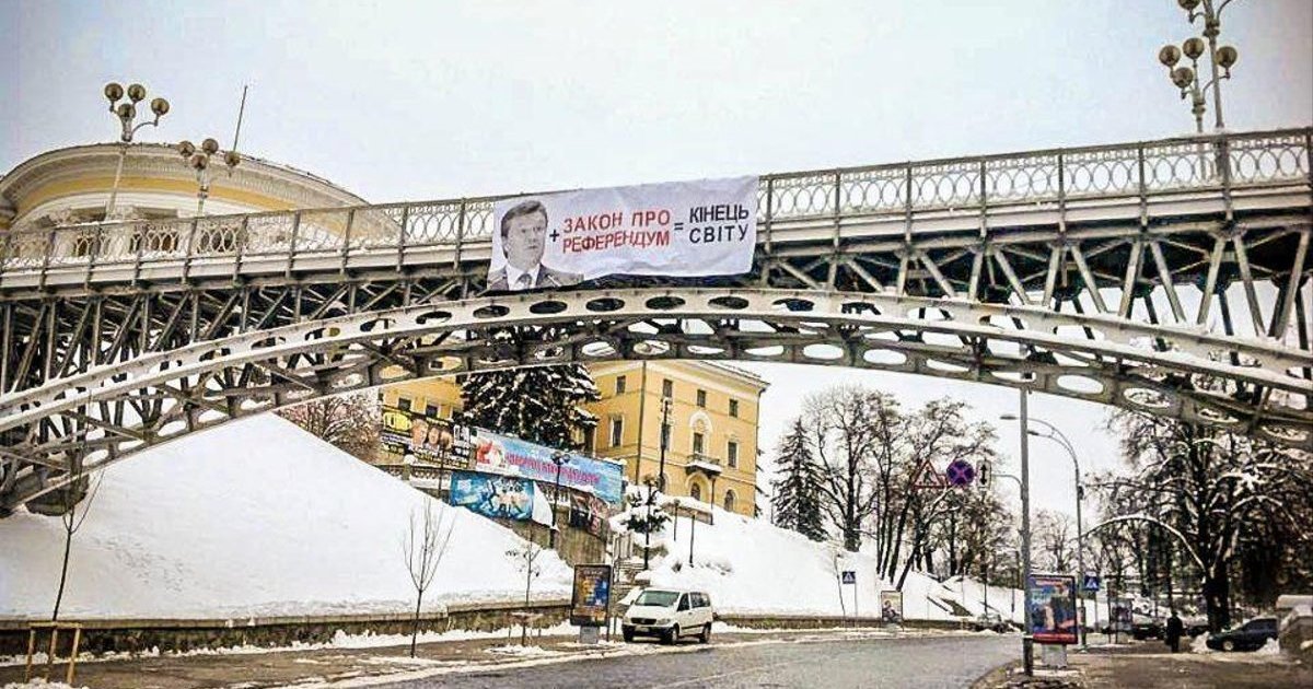Банер с определением конца света для украинцев выглядит так: "Янукович + закон про референдум = кінець світу", - отмечает Цензор.НЕТ.
