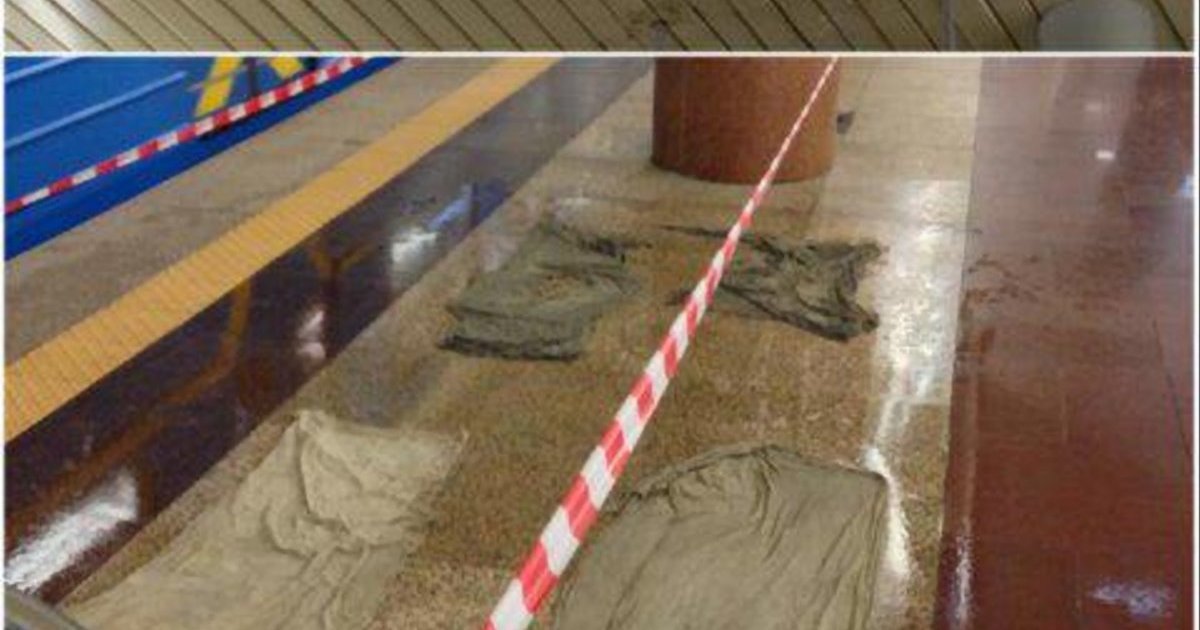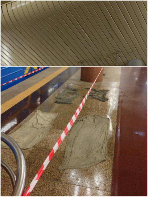 С потолка станции "Демеевская" вода течет прямо на платформу. Сотрудникам столичной подземки ничего не остается, кроме как успевать менять тряпки.