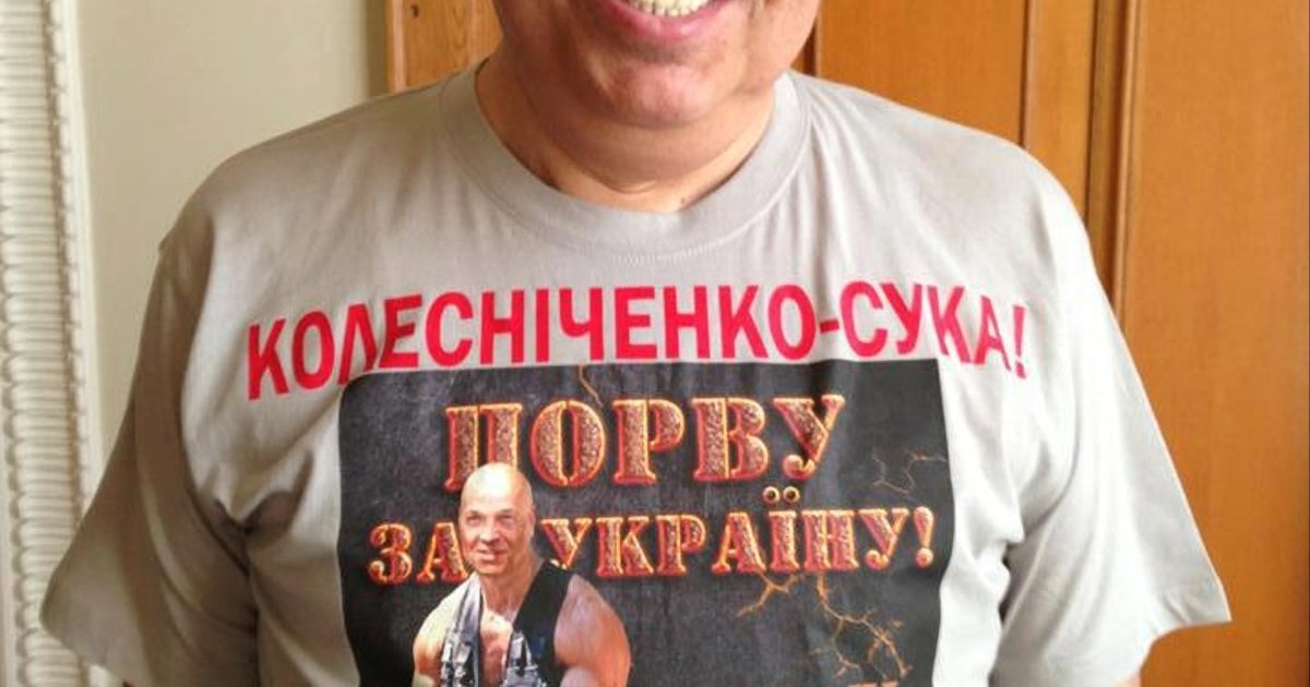 Помимо текста: "Колесніченко -сука! Порву за Україну! Москаль" на футболке изображен коллаж: к торсу героя Арнольда Шварценнеггера из фильма "Хищник" путем монтажа добавлена голова народного депутата Москаля.