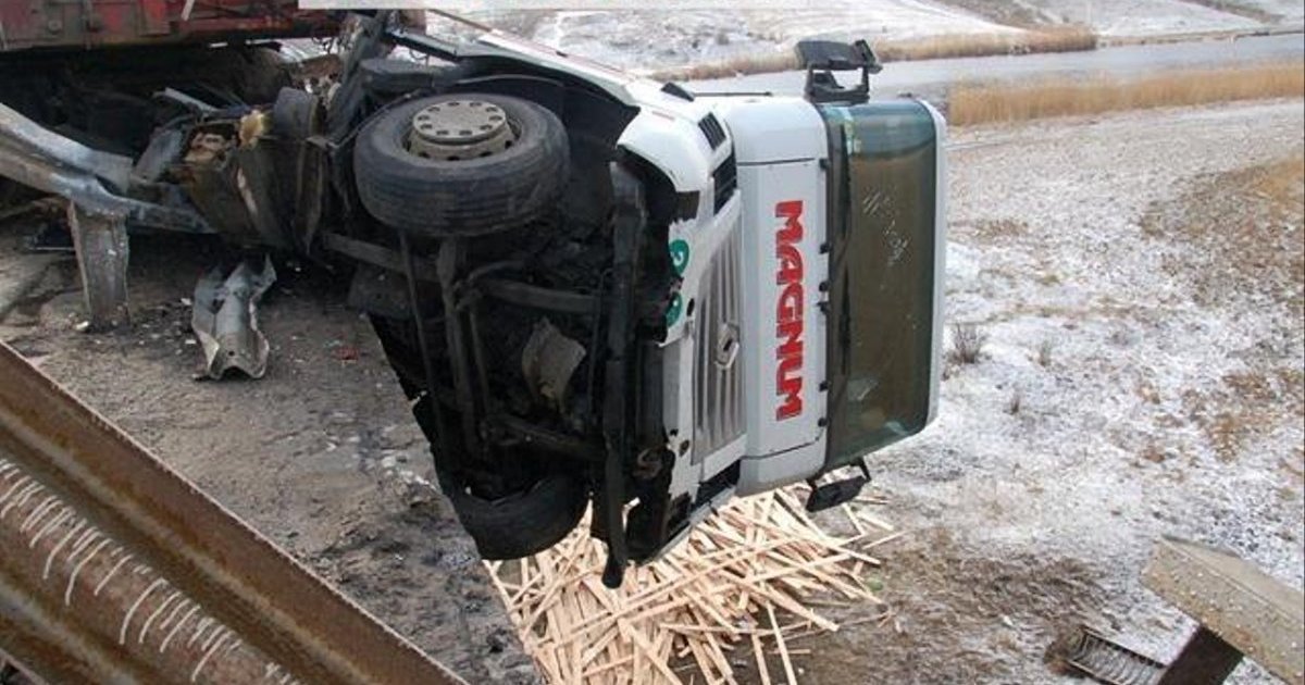 Полуприцеп развернуло в направлении, противоположном движению. О скорости, с которой ехал автомобиль, косвенно может свидетельствовать тот факт, что доски, находившиеся в полуприцепе, улетели на расстояние около 100 метров.