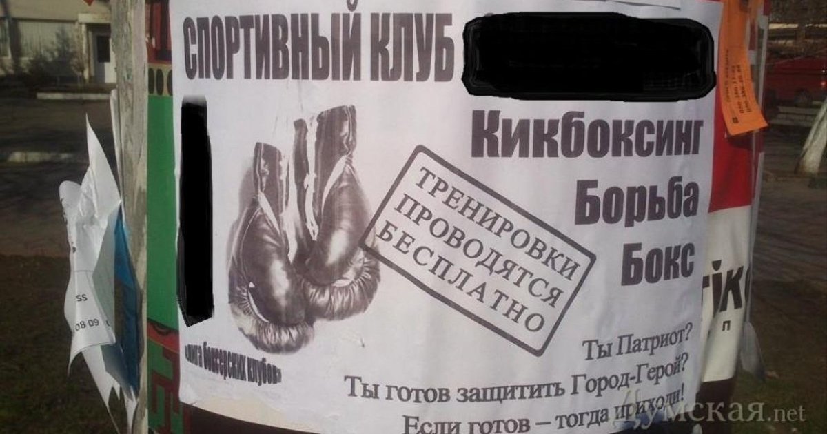 Один из одесских спортивных клубов предлагает молодым людям бесплатные занятия по боксу, кикбоксингу и борьбе в обмен на участие в митингах русской националистической организации «Молодежное единство».