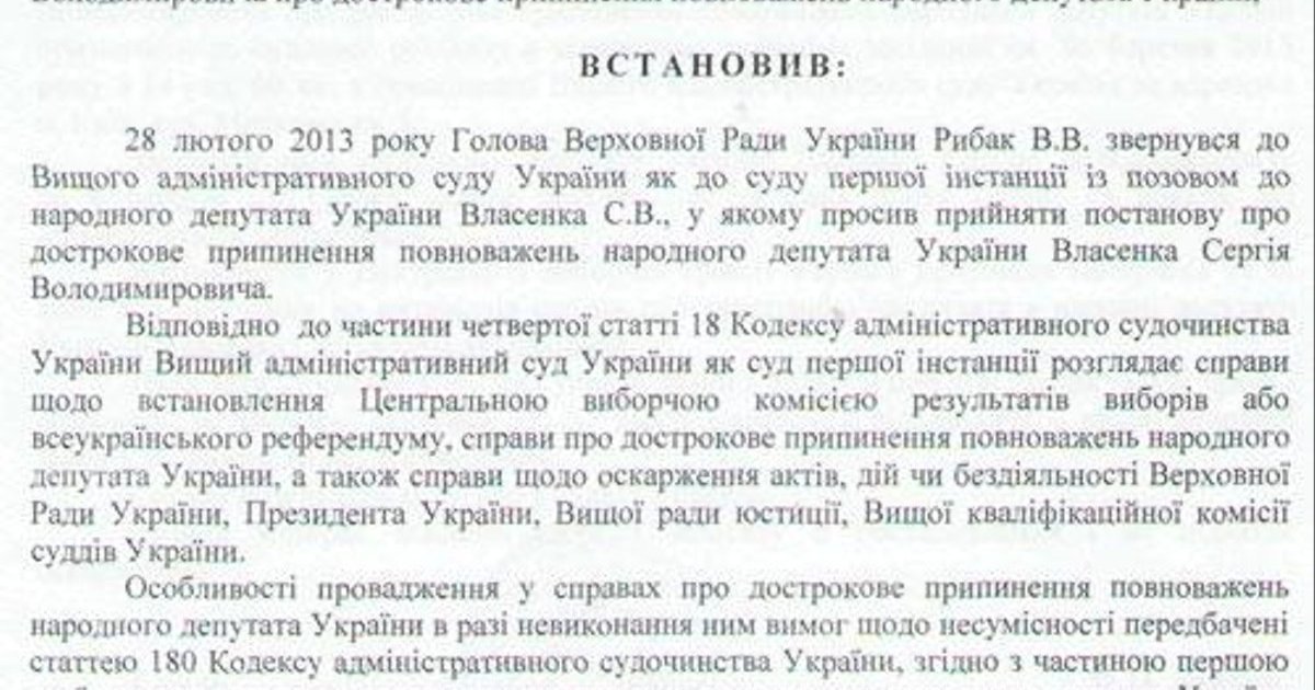 Как сообщалось ранее, руководство регламентного комитета сфальсифицировало решение о лишении Сергея Власенко депутатского мандата. На следующий день спикер Владимир Рыбак на основании сфальсифицированных документов направил представление в ВАСУ.