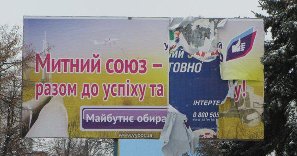 На одном из билбордов по ул.Киевской в областном центре слоган «Митний союз – разом до успіху і добробуту» из-за частичного обрыва плаката трансформировался в анти-лозунг.