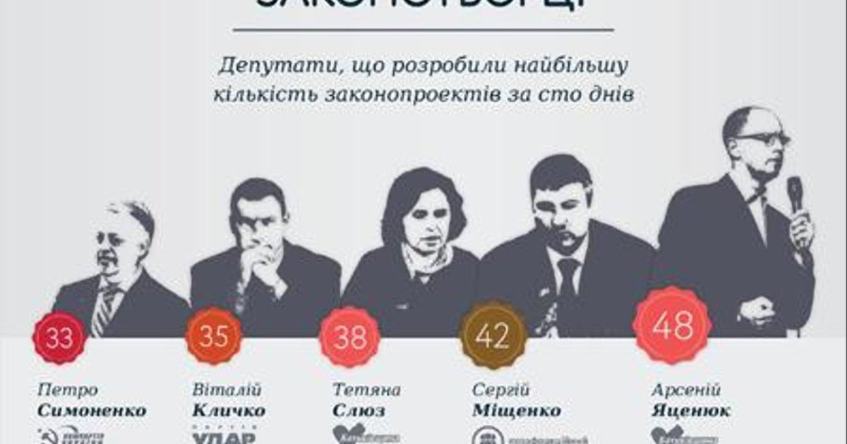В рейтинге наиболее активных законотворцев первое место занимает Арсений Яценюк, Сергей Мищенко, Татьяна Слюз, Виталий Кличко и Петр Симоненко.