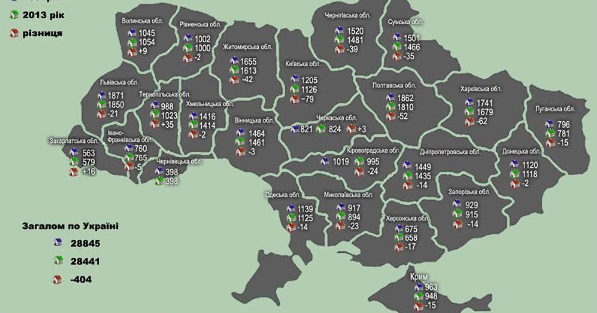 C 1991 по 2012 годы в Украине исчезло 528 сельских населенных пунктов, среди которых 34 поселка и 494 села в связи с отсутствием в них жителей.