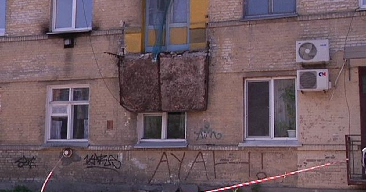 Балкон завис на креплениях напротив первого этажа дома. За несколько секунд до падения балкона под ним прошла компания молодых людей, пишет 34 канал