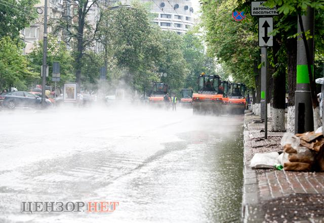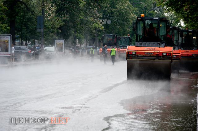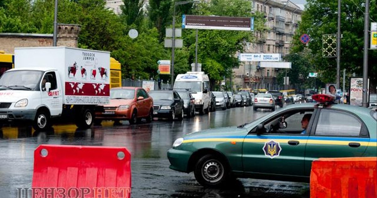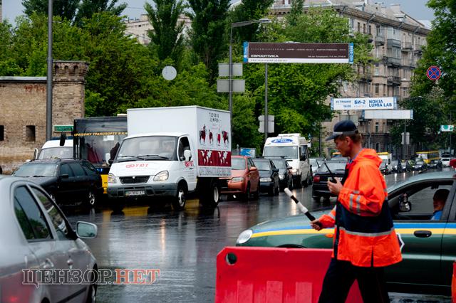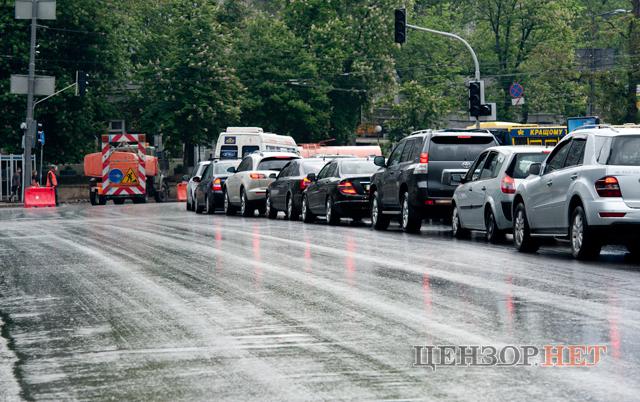 Стоит Парковая дорога, начиная с Набережного шоссе. С другой стороны стоит улица Михаила Грушевского. Полностью перекрыто движение по улице Ивана Мазепы.