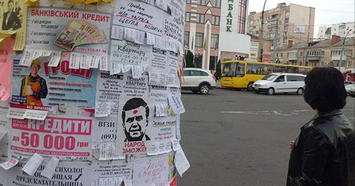 На улицах Хмельницкого неизвестные наклеили изображения лица Президента Виктора Януковича с красной меткой на лбу.