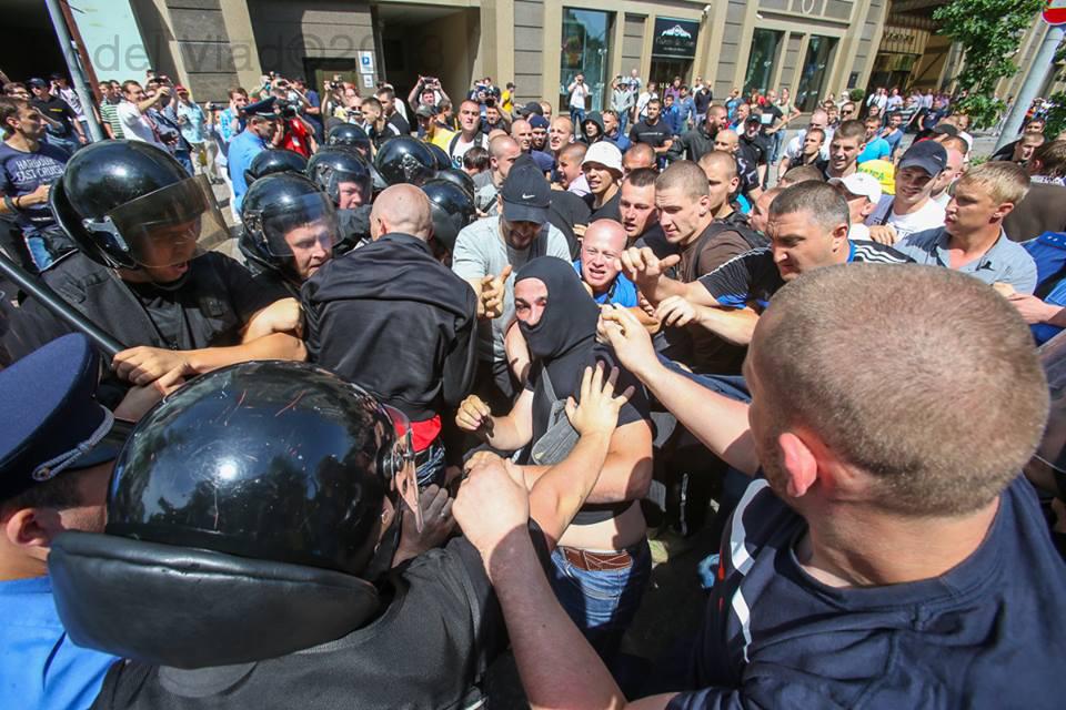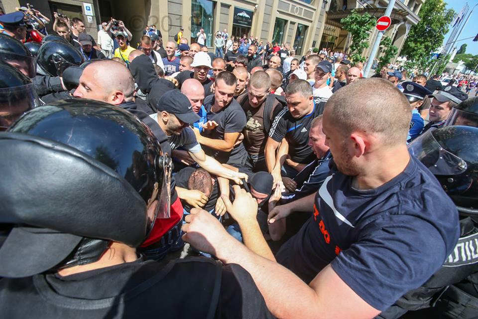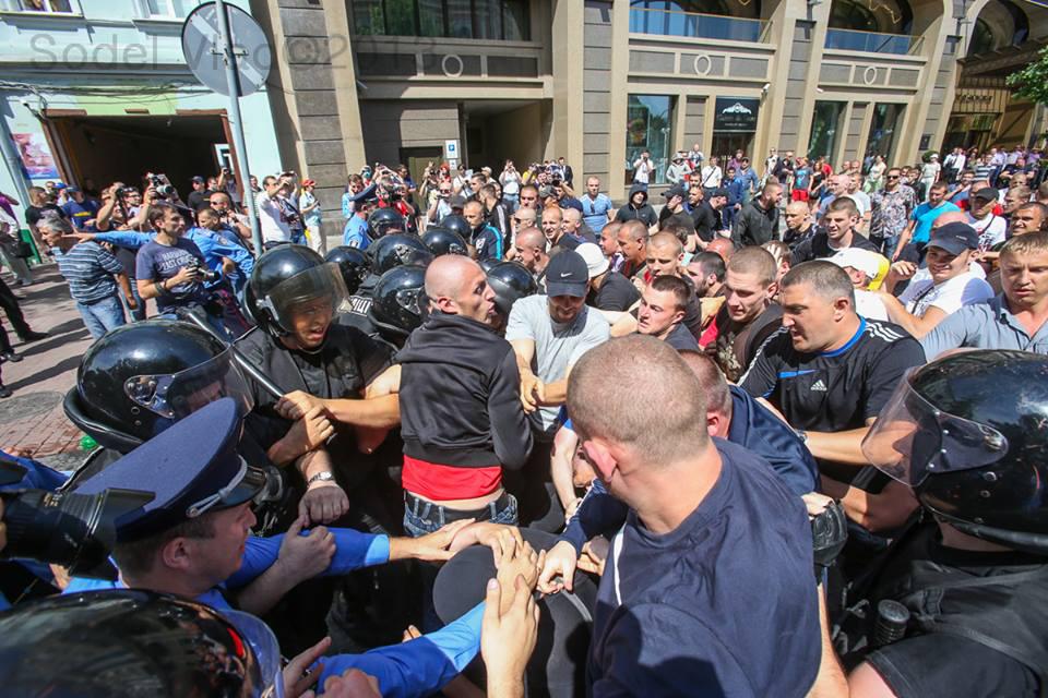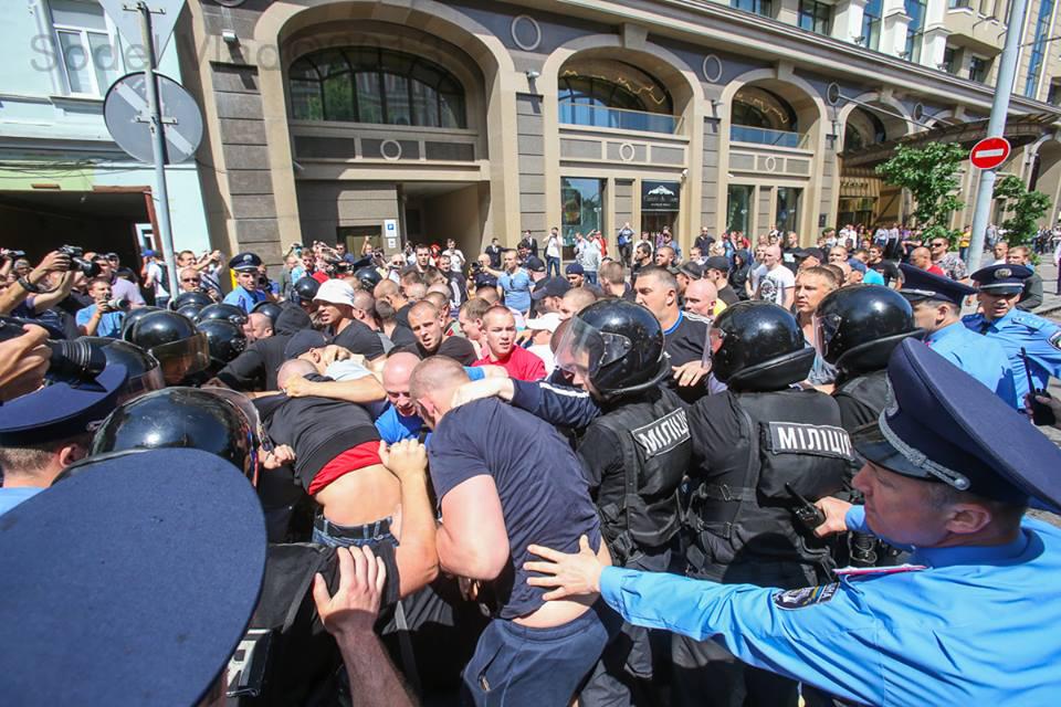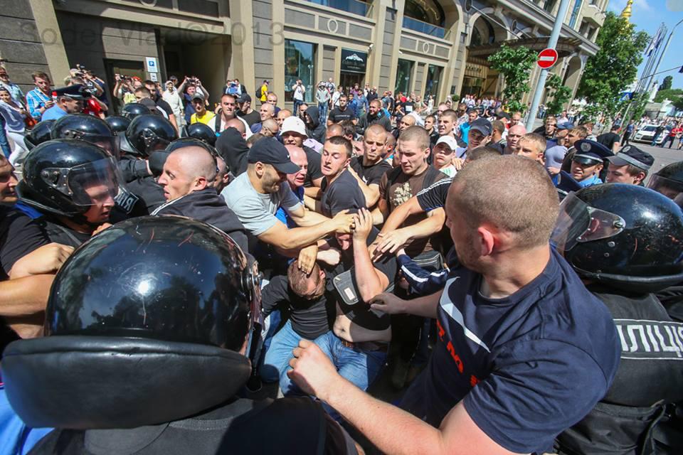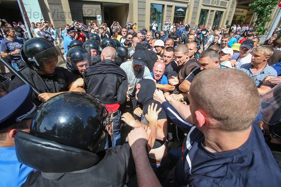 В соцсети Facebook Влад Содель выложил новую подборку фото драки с митинга в Киеве 18 мая. Правоохранители стояли рядом, а когда избитый пытался вырваться, то руками подталкивали его обратно.