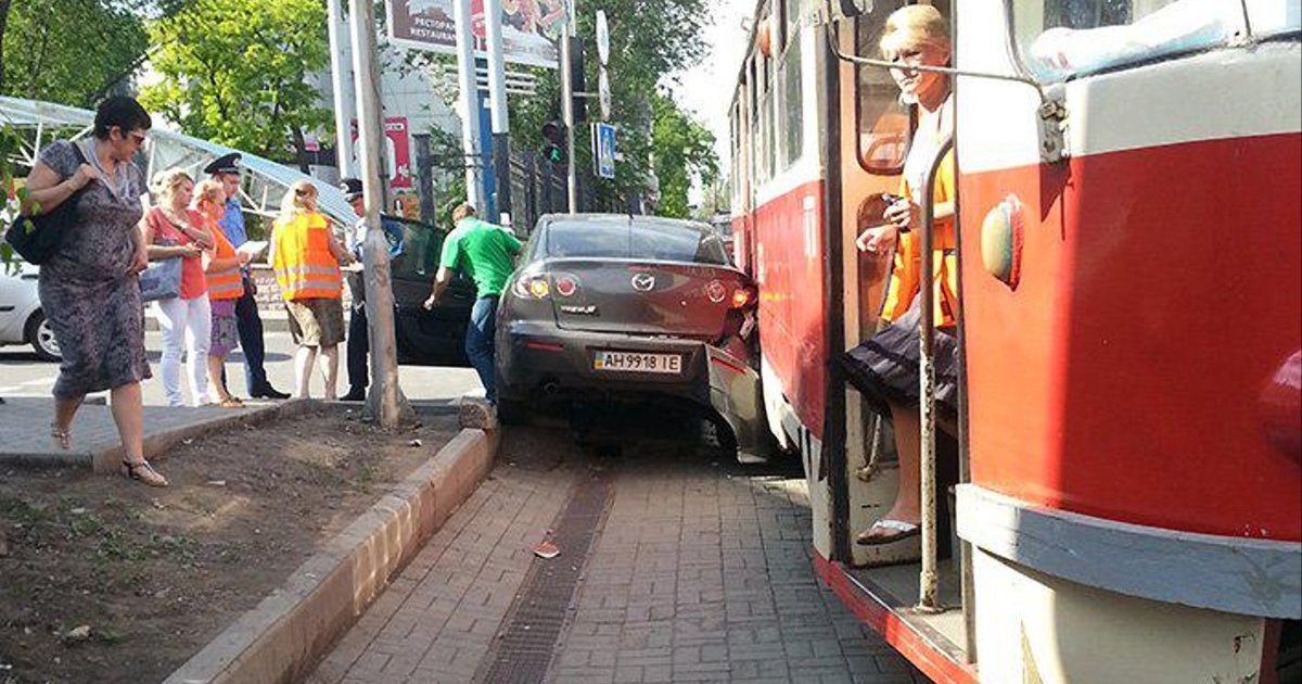 В Донецке водитель «Мазды» неосмотрительно решил обогнать трамвай маршрута №1. В районе пересечения улицы Челюскинцев и бульвара Шевченко, где дорожное полотно сужается почти до минимума, элетромашина прижала легковушку к бордюру.