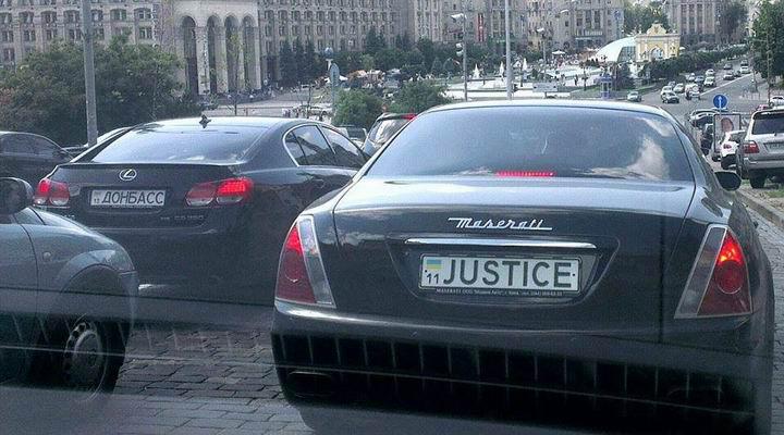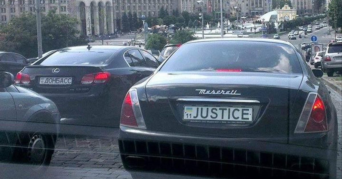 Дорогие автомобили с персональными номерами "ДОНБАСС" и "JUSTICE" (Правосудие) выезжают на Крещатик.