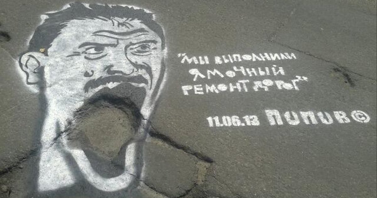 В Голосеевском районе на дорожных ямах появилось изображение головы КГГА Александра Попова.
