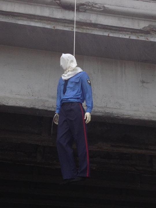 Повешенный манекен работника Госавтоинспекции появился сегодня утром на Воздухофлотском мосту Киева