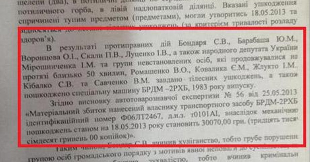 "В результате противоправных действий Бондаря, Барабаша, Воронцова, Скалы, Луценко, а также народного депутата Мирошниченко и группы неустановленных лиц, которые продолжались в течение 50-ти минут, Ромашенко, Ковалику, Жукто, Кибалко и Савченко нанесены телесные повреждения, а также повреждена специальная машина БРДМ ", - говорится в ходатайстве об аресте Бондаря.