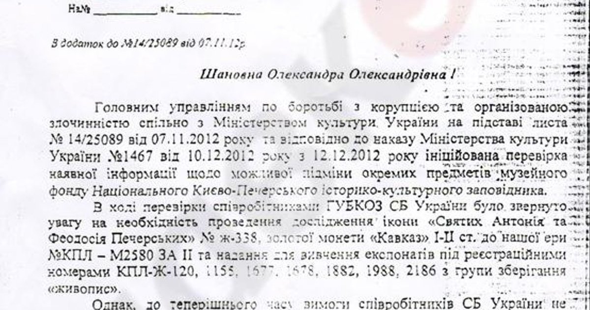 В распоряжение СМИ попало письмо, в котором сотрудники СБУ сообщали руководству Минкульта о том, что так и не получили доступа к фонду заповедника. Служба безопасности от лица заместителя начальника Главного управления Владимира Ляпкина попросила на тот момент заместителя министра культуры Украины Александру Губину «ускорить» доступ к экспонатам. Сотрудники СБУ обратили внимание, в первую очередь, на необходимость проверки исследования иконы «Святых Антония и Феодосия Печерских», золотой монеты «Кавказ» I-II столетия до нашей эры, а также на предоставление для изучения ряда экспонатов из группы «Живопись».
