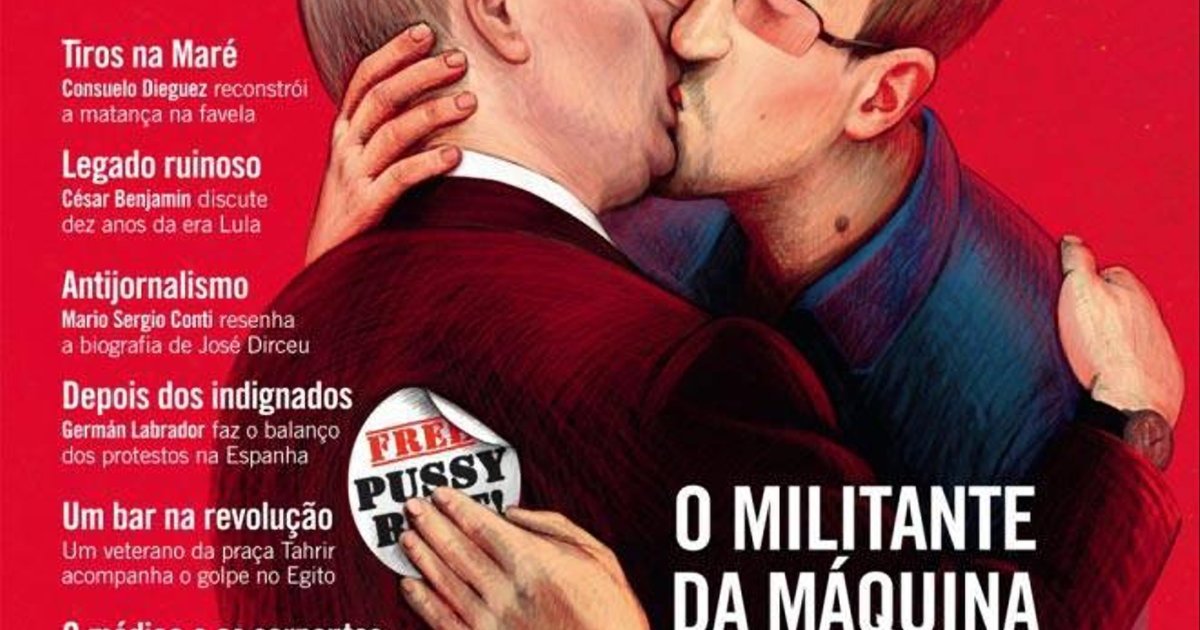 Бразильский журнал о культуре Piaui изобразил на обложке августовского номера президента России Владимира Путина, целующегося с сотрудником ЦРУ Эдвардом Сноуденом.