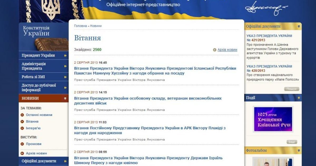 Согласно данным, приведенным на сайте президента Украины, последнее поздравление Виктор Янукович направил президенту Исламской Республики Пакистан Мамнуну Хуссейну по случаю избрания на должность. Это было 2 августа, и с того дня на сайте президента Украины не было новых сообщений об отправленных поздравлениях, передает Цензор.НЕТ со ссылкой на НБН.
