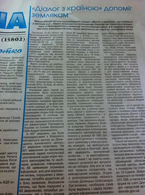 В текстовом варианте эта история была опубликована в газете "Донеччина". В материале описывается обращение директора Дома детей и юношества Кировского района Донецка, которая в рамках проекта Януковича попросила материальную помощь в 40 тысяч гривен для организации участия детей в международном конкурсе в Болгарии. Данная сумма была выделена из бюджета города Донецк: